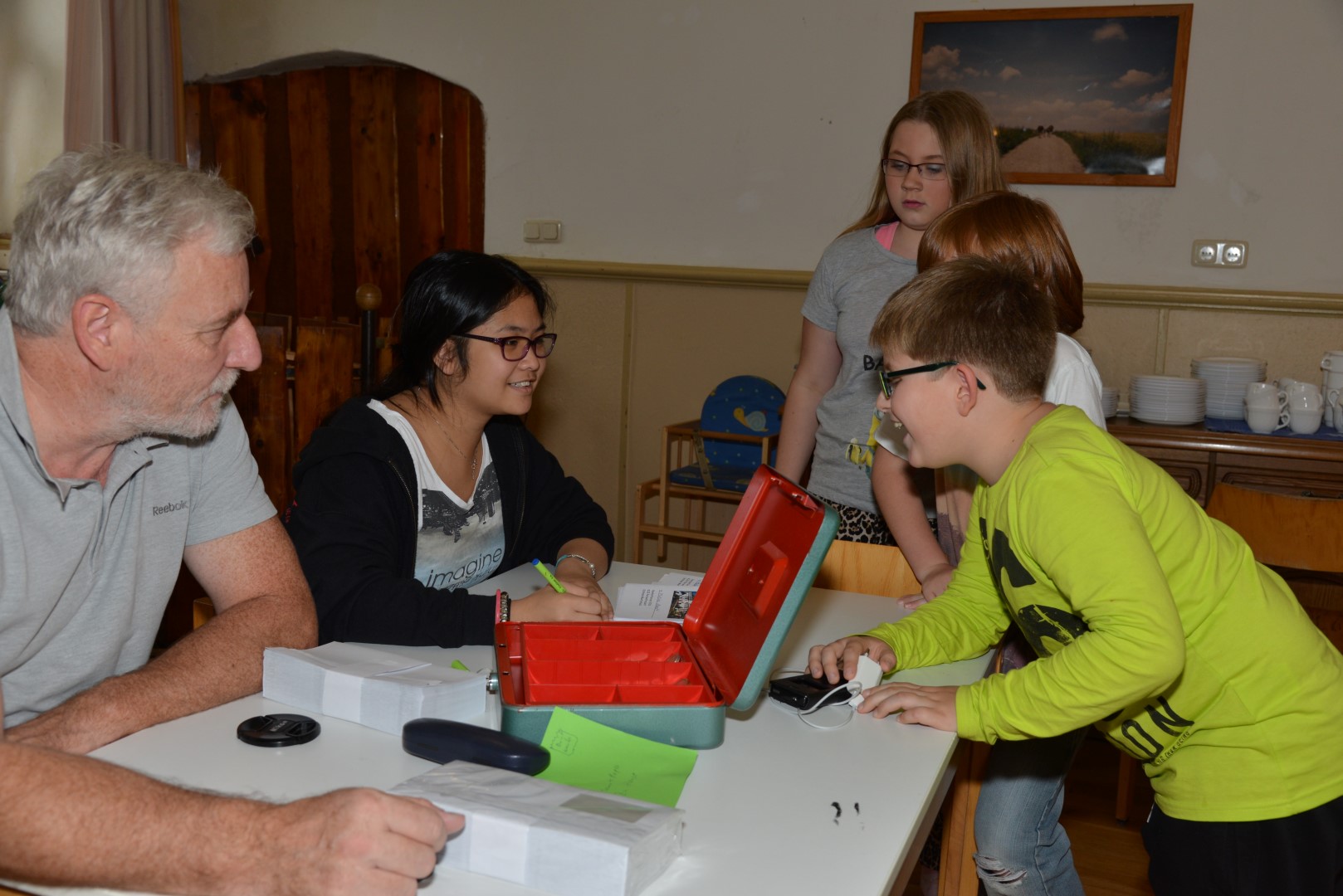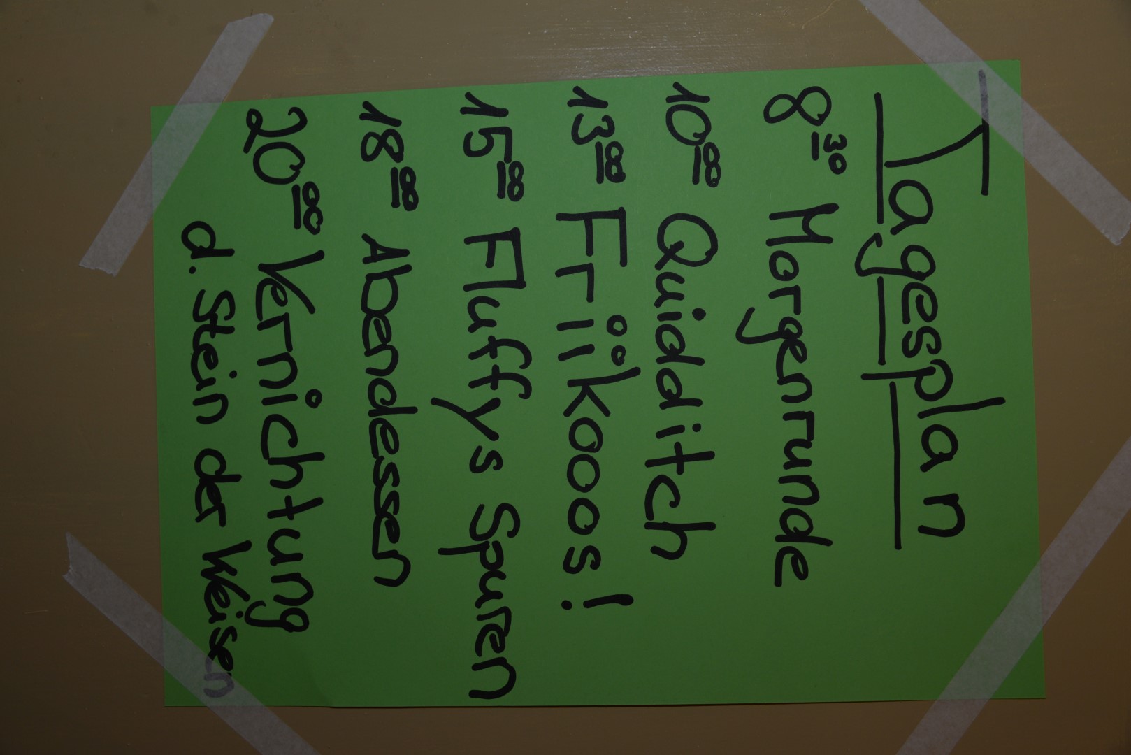 Nach den Diensten ging es um zehn Uhr mit dem Programm los. Wir haben Quidditch gespielt. Natürlich nicht auf Besen, aber mit der gleichen Besetzung im Team. Dabei haben die Häuser gegeneinander auf dem Feld gespielt und konnten zum Spielende den Schnatz ergattern und somit das Spiel gewinnen (oder zumindest 80 Punkte, was nicht immer zum Sieg reichte). Vor dem Mittagessen konnten, nach dem vielen Rennen, alle Kinder duschen gehen, sodass sie wieder frisch um 13Uhr am Mittagstisch saßen.