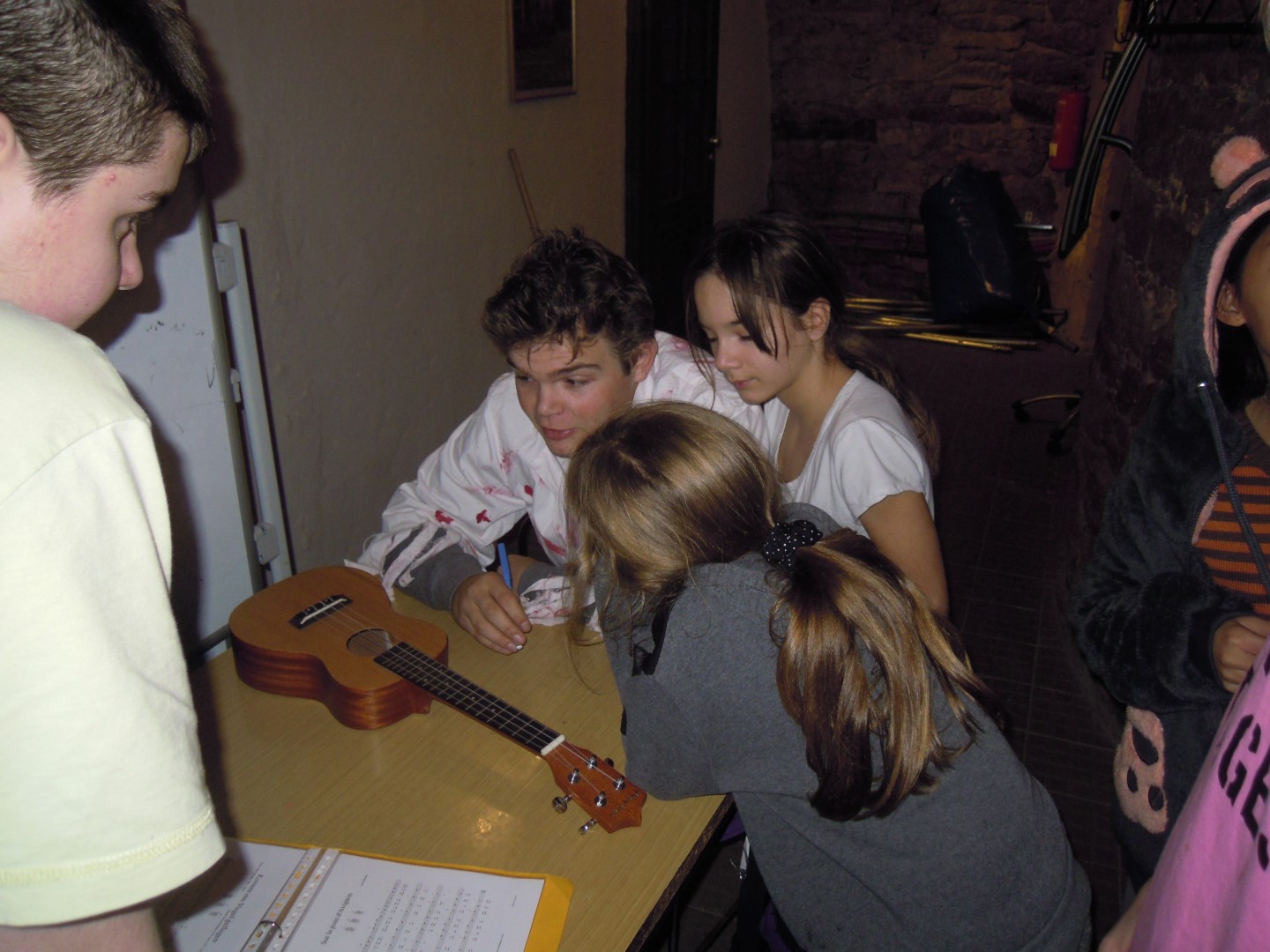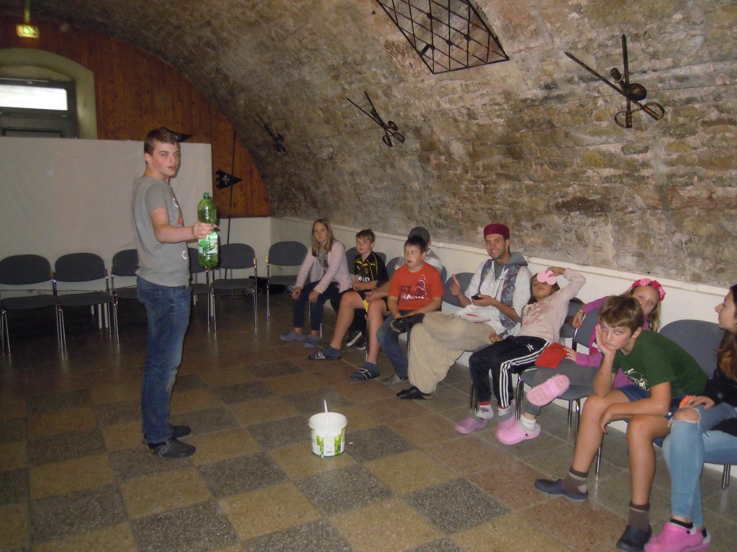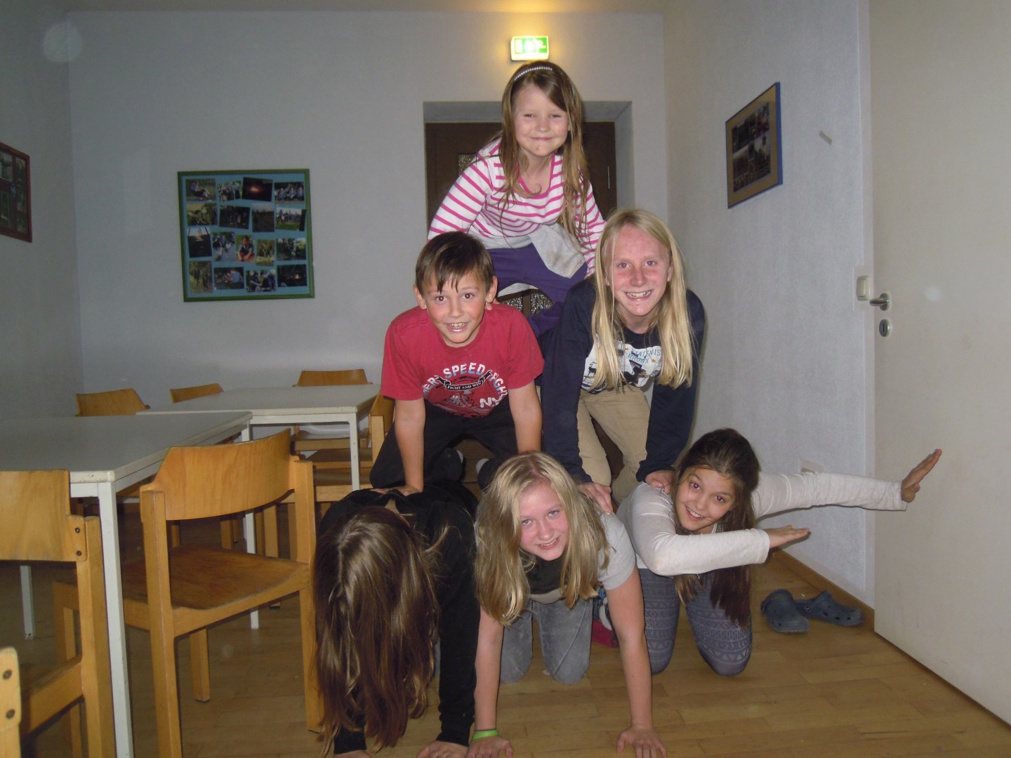 Der Tag heute begann etwas anders als die bisherigen: Die Leiter hatten in der Nacht ein paar kleinere Streiche gespielt, wie zum Beispiel Schuhe zusammenbinden und wie eine Girlande aufhängen, „Spinnennetze“ in den Zimmern und Fluren aufhängen und die Tische aus dem Essraum in den Flur stellen und für das Frühstück decken. Gegessen wurde also am Morgen statt geordnet und Tischweise in den Altersgruppen im Flur und mit wem man wollte. Auch Kakao gab es heute nicht zum Frühstück – stattdessen gab es Slush-Ice!