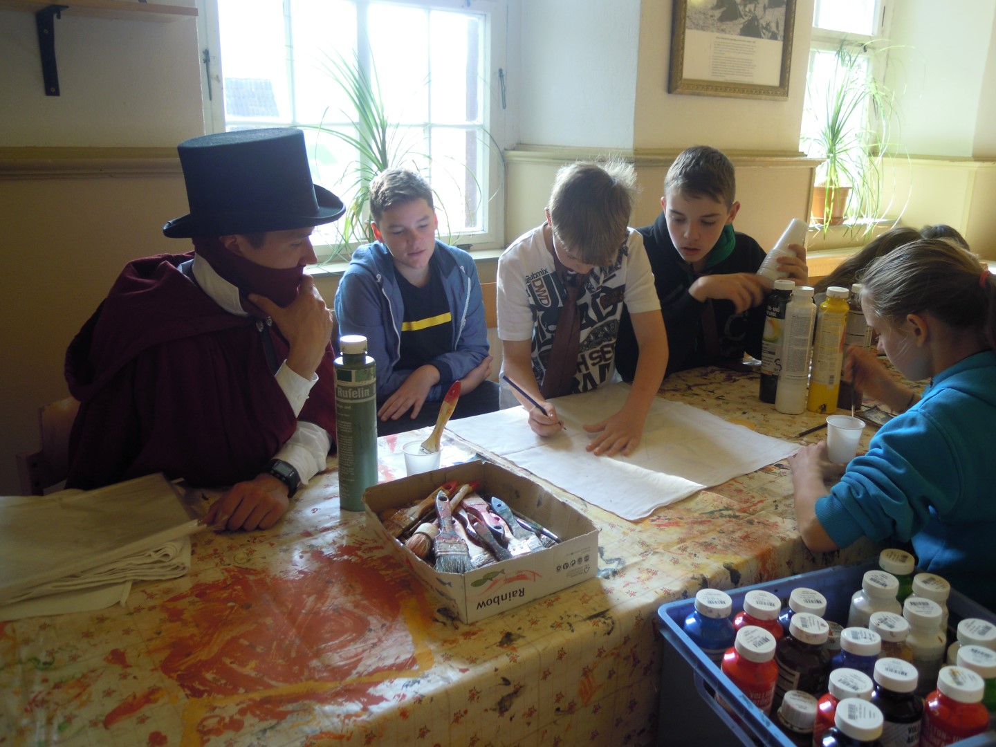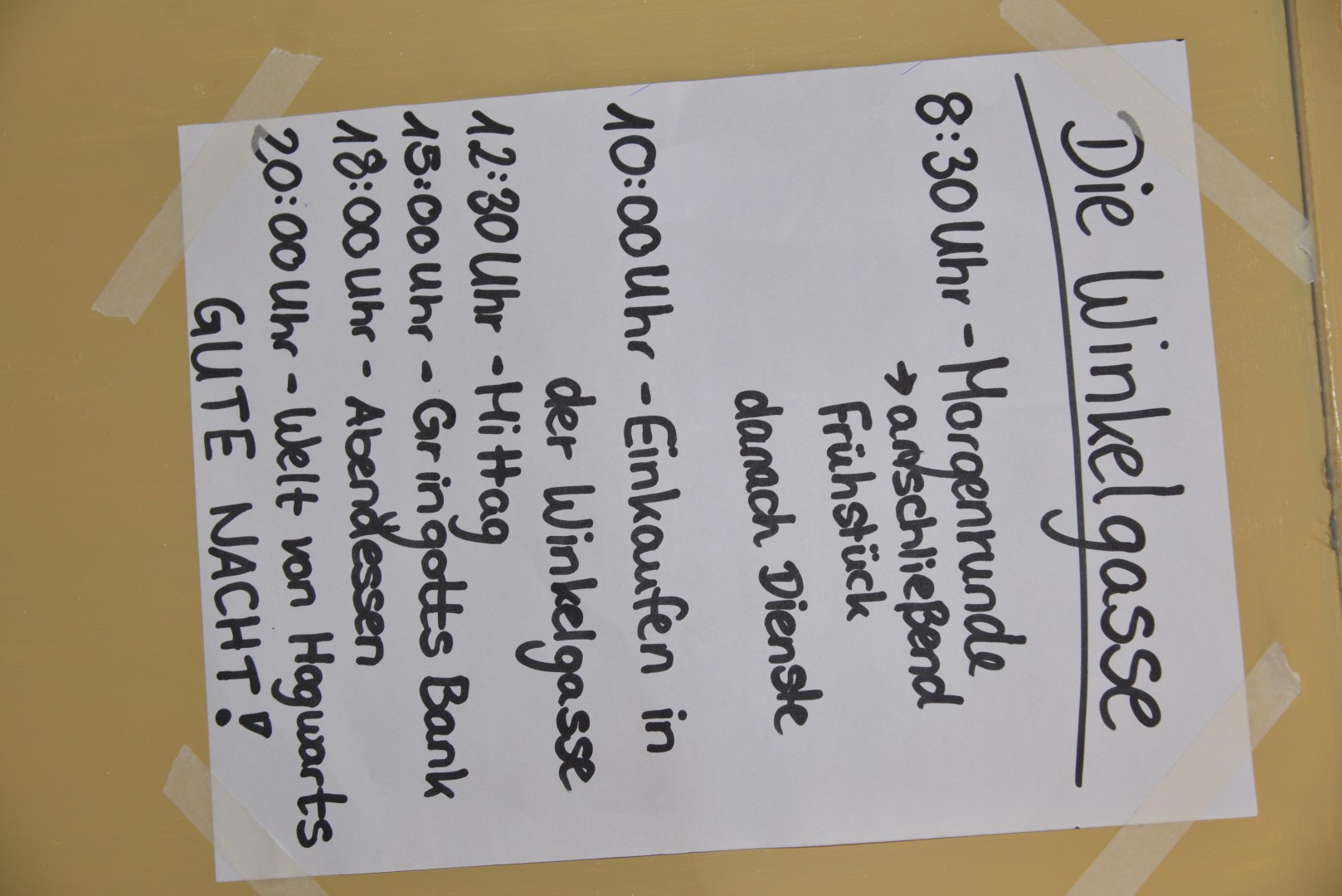 Um 10Uhr ging es dann mit dem Programm weiter. Am Vormittag hatten wir Workshops, in denen die Kinder Zauberstäbe basteln, Wappen malen, Zaubertränke brauen, Flugstunden nehmen, Kräuter erkunden, Tiere basteln, Zaubersprüche ausdenken und Briefe mit Zaubertinte schreiben konnten.